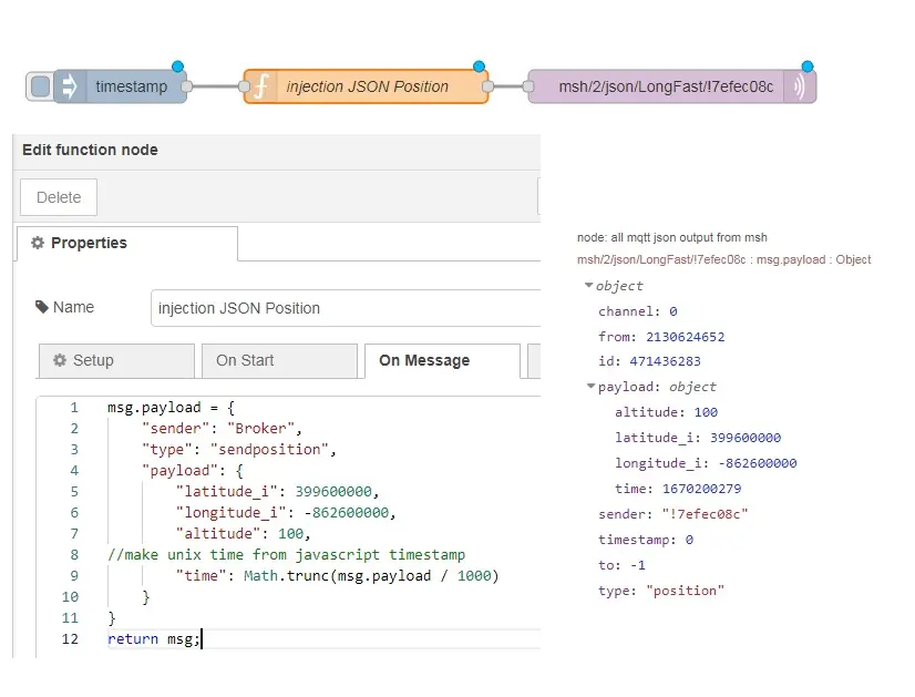 "func": "msg.payload={\n \"latitudeI\": 399600000,\n \"longitudeI\": -862600000,\n \"altitude\": 100\n}\nreturn msg;",